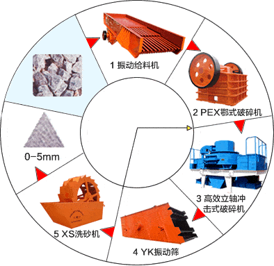 首先,石料由粗碎機進行初步破碎,然后,產成的粗料由膠帶輸送機輸送至細碎機進行進一步破碎,細碎后的石料進振動篩篩分出兩種石子,滿足制砂機進料粒度的石子進制砂機制砂,另一部分返料進細破。進制砂機的石子一部分制成砂,經洗砂機(可選)清洗后制成成品砂,另一部分進制砂機再次破碎。