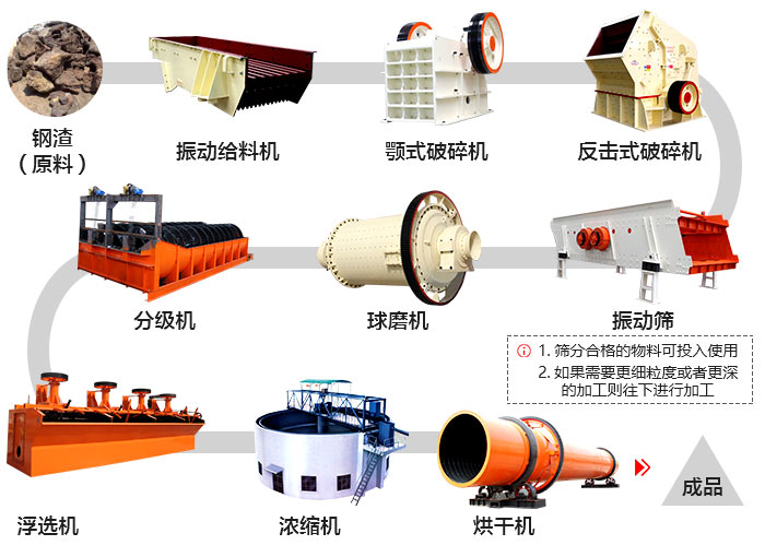 在振動給料機的作用下,將堆積的鋼渣均勻、連續(xù)的送到顎式破碎機進行粗碎加工,粗碎后的鋼渣通過振動篩,合格的進入反擊式破碎機或圓錐破碎機進行中、細碎加工,不合格的返回上層繼續(xù)破碎,相同的經反擊式破碎機或圓錐破碎機破碎后的鋼渣合格的通過輸送機輸出,即為成品,不合格的返回繼續(xù)破碎加工。