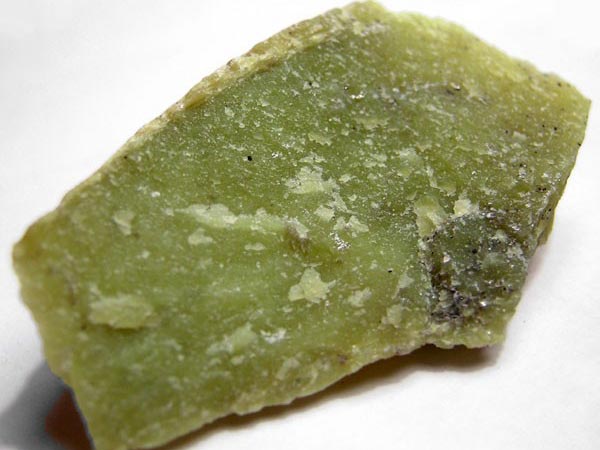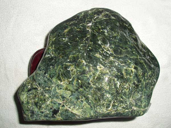 蛇紋石質(zhì)玉石質(zhì)地呈細膩的致密塊體,質(zhì)地細膩,用手觸摸有滑感。它由細小纖維狀、葉片狀和膠狀蛇紋石晶體組成,呈網(wǎng)斑狀結(jié)構(gòu)。有時在均勻分布的基底上,可見密集堆積的云朵狀白色斑狀。少數(shù)纖維狀塊體琢磨后有貓眼效應(yīng)。